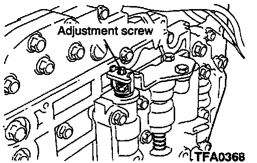 CAUTION: The adjustment should be made at an oil temperature of 70-80°C (158-176°F). If the adjustment is made at an oil temperature that is too high, the line pressure will decrease during idling, with the result that a correct adjustment cannot be made.