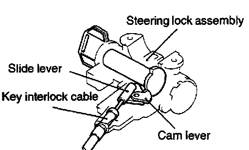 2. Install the slide lever, key interlock cable, and cam lever to the steering lock assembly as shown.