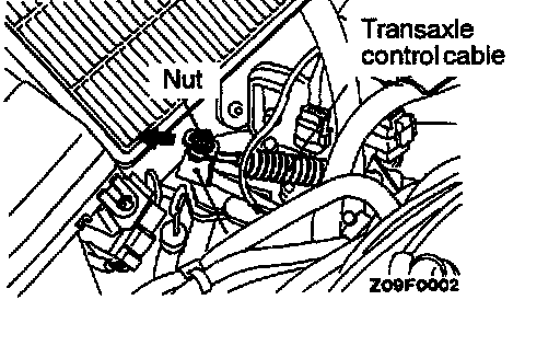 2. Loosen the nut and slightly pull the transaxle control cable in the direction of the arrow; then, tighten the nut.