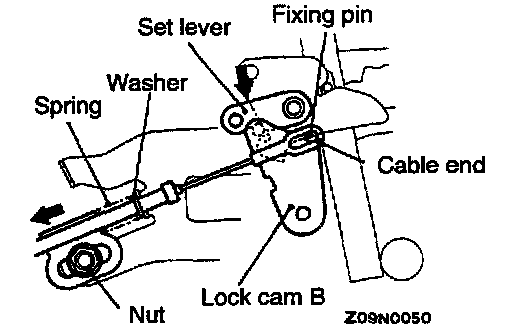 6. Pressing the set lever to prevent lock cam B from moving, lightly pull the shift lock cable to take up slack and tighten the nut to secure the shift lock cable into position.
