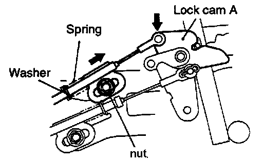 5. Connect the shift lock cable to lock cam B and temporarily tighten the nut. At this time, install the spring and washer, which have been fitted to the shift lock cable, as shown.