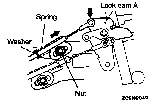 7. Connect the key interlock cable to lock cam A and temporarily tighten the nut. At this time, install the spring and washer, which have been fitted to the key interlock cable, as shown.