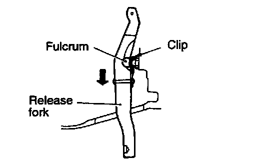 Slide release fork in direction of arrow and disengage fulcrum from clip to remove release fork. Be careful not to cause damage to clip by pushing release fork in the direction other than that of arrow and removing it with force.