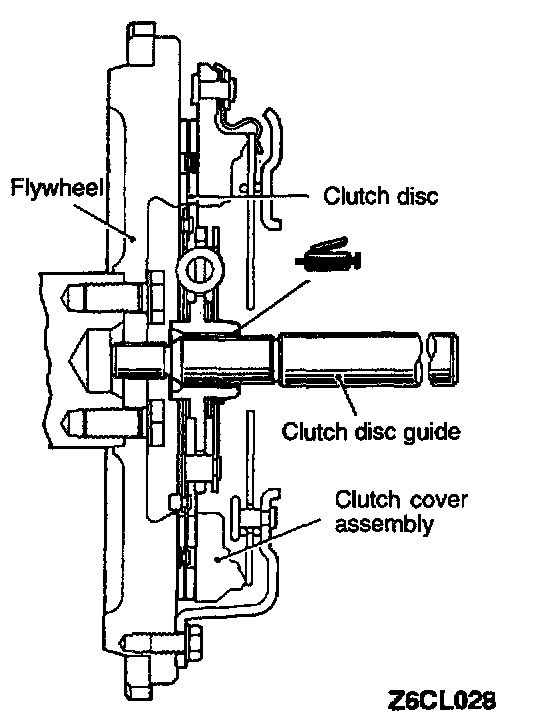 2. Using clutch disc guide to position clutch disc on flywheel.