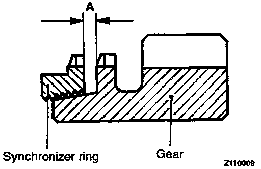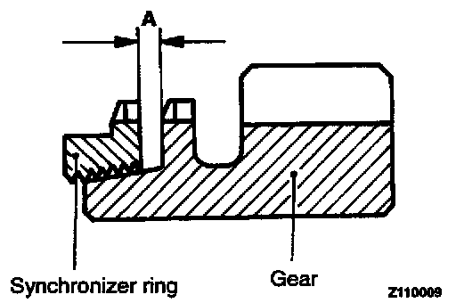 3. Force the synchronizer ring toward the clutch gear and check clearance "A". Replace if it is out of specification.