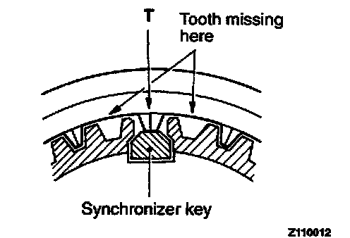 2. The synchronizer sleeve has tooth missing at six portions. Assemble the hub to the sleeve in such a way that the center tooth "T" between two missing teeth will touch the synchronizer key.