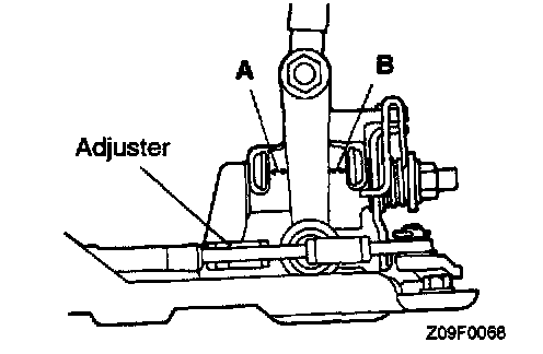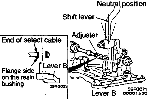 2. With the shift lever on the passenger compartment side in the neutral position, turn adjuster on select cable so that select cable end is positioned as shown with reference to lever B of shift lever.