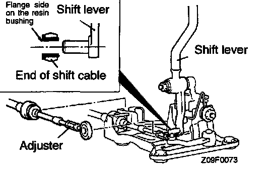 4. Turn adjuster on shift cable so that shift cable end is positioned as shown with reference to shift lever on the passenger compartment side.