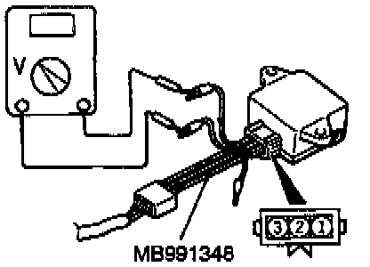 2) With the ignition switch turned ON, read output voltage between terminals No. 2 and No. 3.