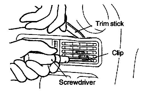 Disengaging the clips (2 positions) of the center air outlet assembly with a flat tip screwdriver, remove the center air outlet assembly with a plastic trim stick.
