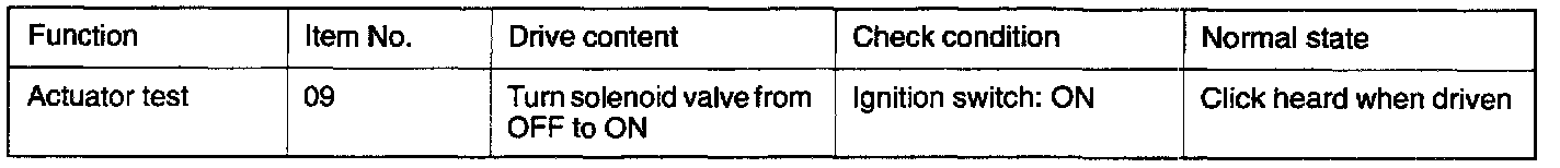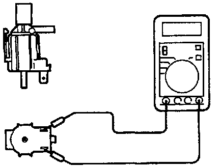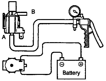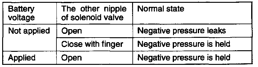 (3) Apply a negative pressure to the nipple to which the black vacuum hose has been connected and check air-tightness with and without the battery voltage applied to the solenoid valve terminal.