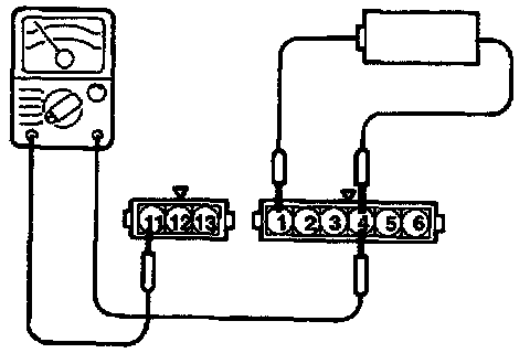 1. Connect the negative (-) terminal of the 1.5 V power supply to terminal (4) of the ignition power transistor; then check whether there is continuity between terminal (12) and terminal (4) when terminal (2) and the positive (+) terminal are connected and disconnected.