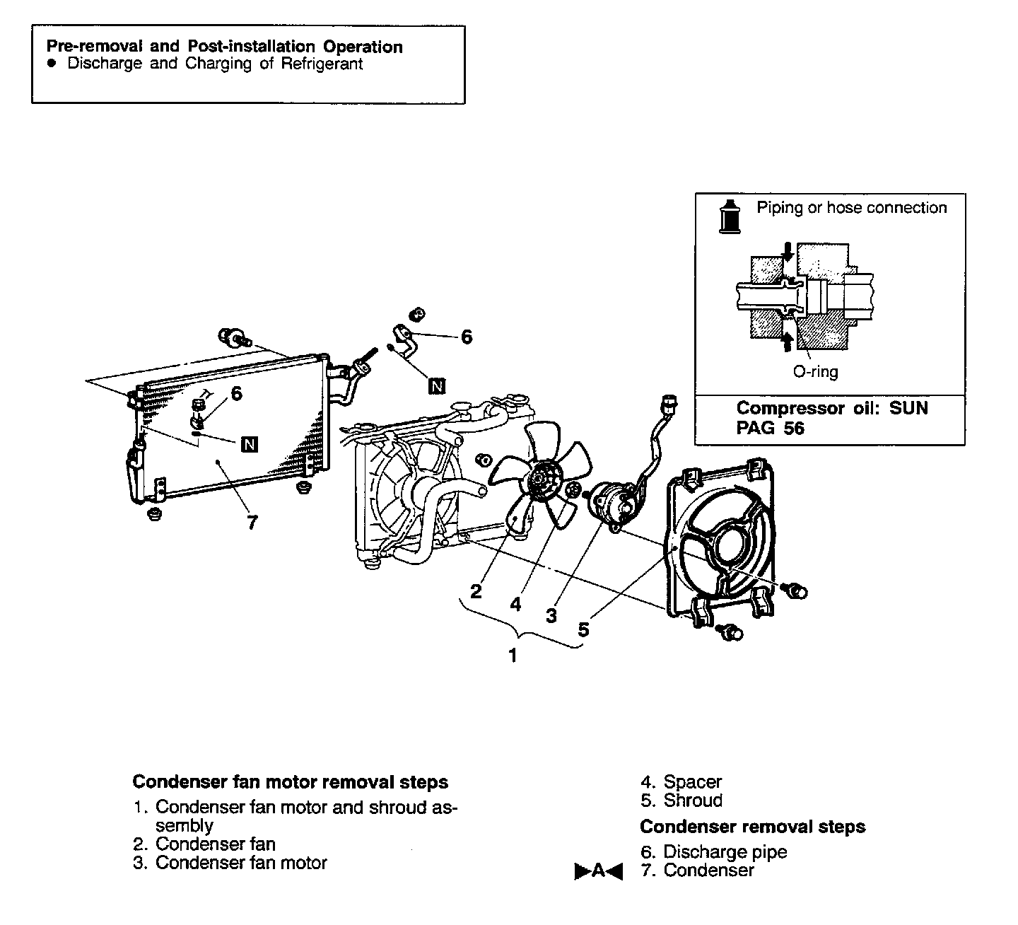 When replacing the condenser with a new one, refill the condenser with a specified amount of compressor oil and install it (to the vehicle).