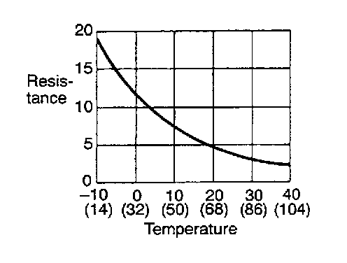 When the resistance value between the sensor terminals is measured under two or more temperature conditions, the resistance value should be close to the values shown in the graph.