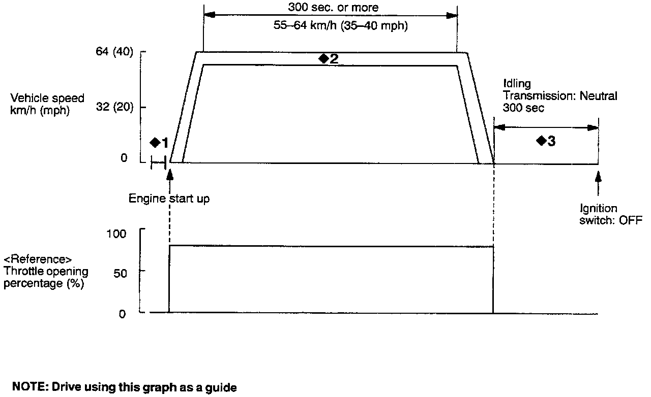 <>2: Start the engine and accelerate quickly until speed reaches 56-64 km/h (35-40mph) After driving for 300 seconds or more, stop the vehicle. Braking or operating the throttle is permissible during this period.