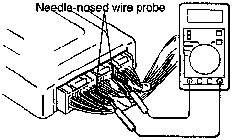 2. Insert the needle-nosed wire probe into each of the ECM connector terminals from the wire side and measure the voltage while referring to the check chart.