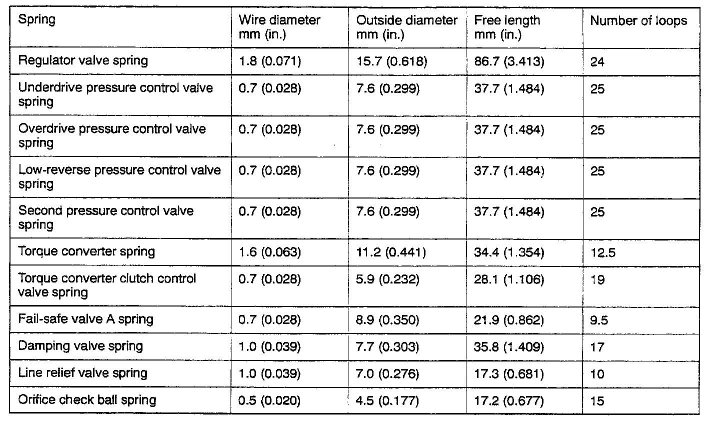 F4A51 4-spd A/T, Valve Body Spring Table: