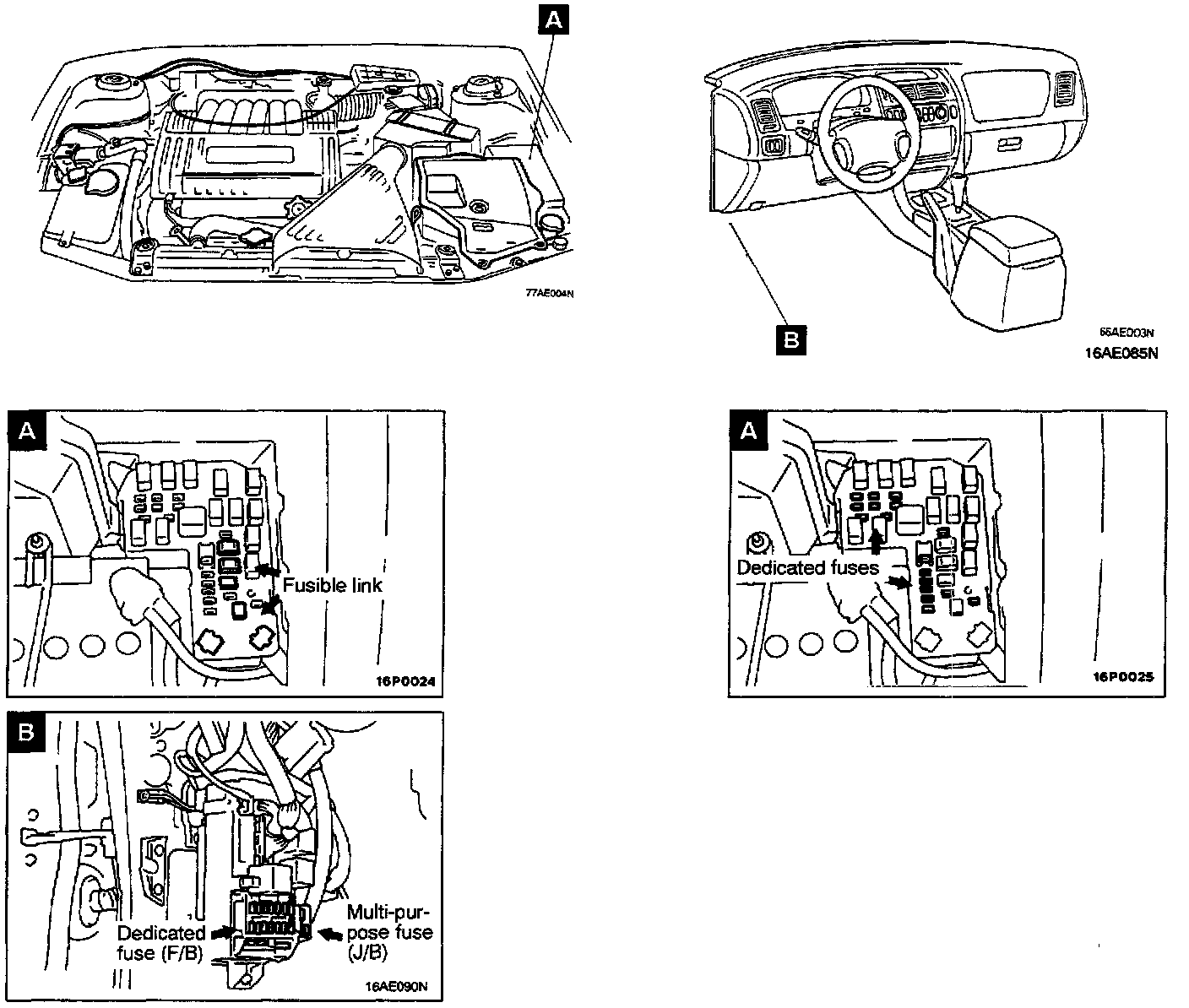 Fusible Link And Fuse Locations Overall View And Views A-B: