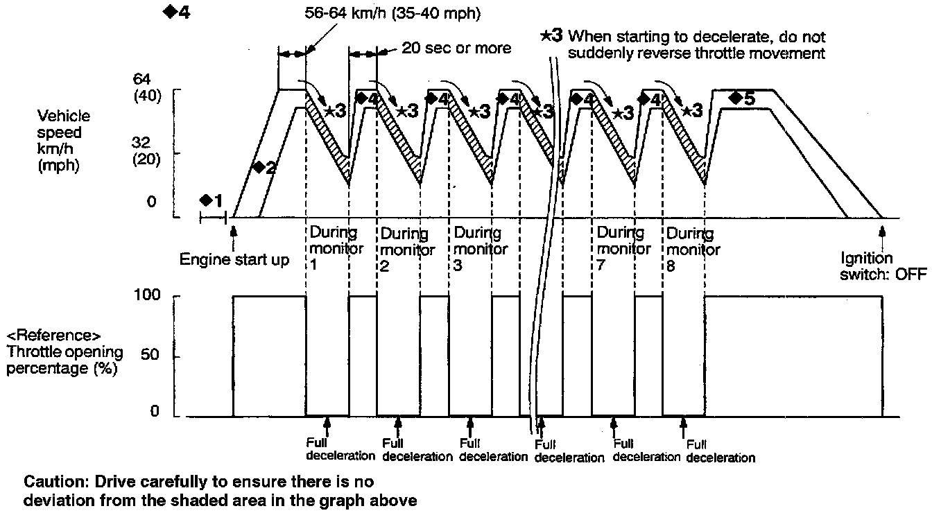 * 3: Monitoring period: When engine speed is between 2,000 and 3,000 rpm, fully close the throttle and decelerate until the engine speed reaches approximately 900 rpm without braking. Do not manipulate the steering wheel or switch any lights on or off during this period.