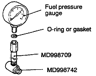 4. Install a fuel pressure gauge on the adapter hose that was set up in step 3. Use a suitable O-ring or gasket between the fuel pressure gauge and the special tool so as to seal in order to prevent fuel leakage at this time.