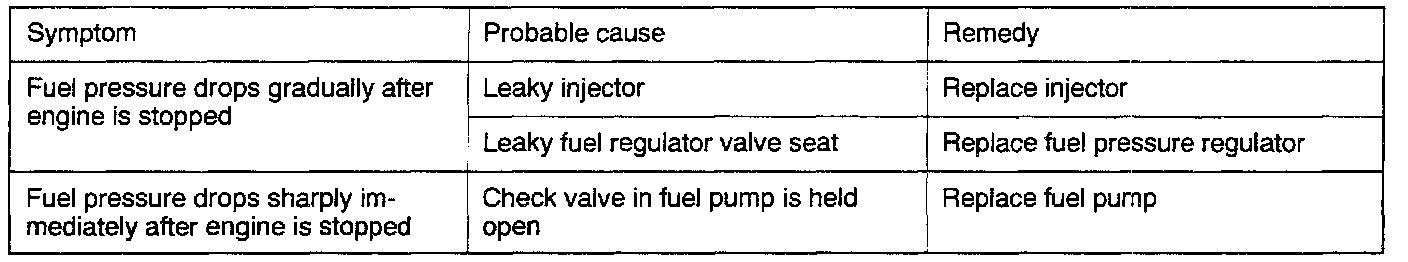 13. Stop the engine and observe fuel pressure gauge reading. Normal if the reading does not drop within 2 minutes. If it does, observe the rate of drop and troubleshoot and repair according to the image above.