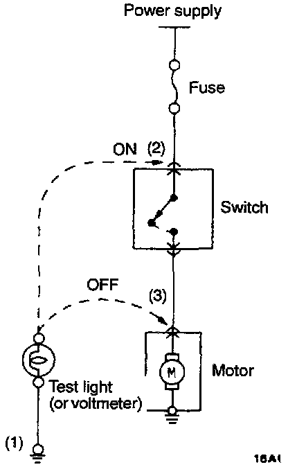 a. Ground one lead wire of the test light. If a voltmeter is used instead of the test light, ground the grounding side lead wire.