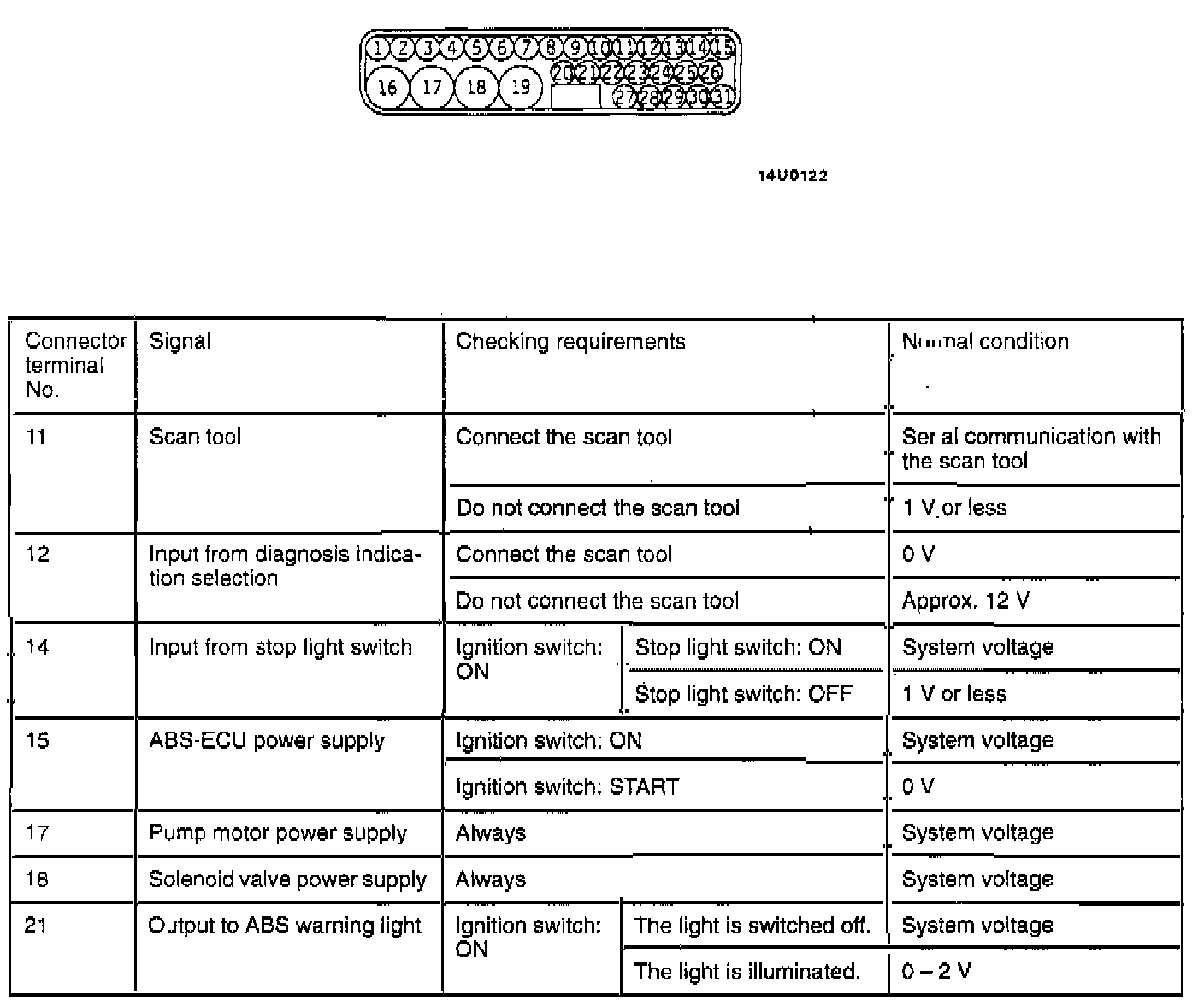 TERMINAL VOLTAGE CHECK CHART1. Measure the voltages between terminals (16) and (19) (ground terminals) and each respective terminal.