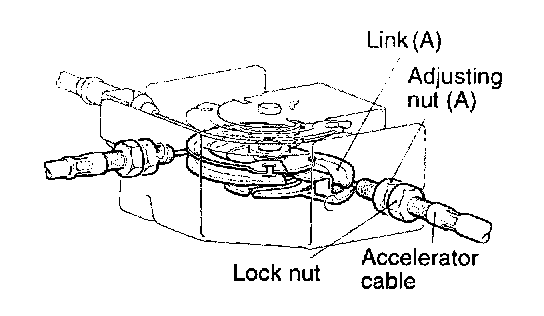 1. Adjust with the adjusting nut A so when the link A hits the stopper, the accelerator cable play (inner cable play reaches the standard value.