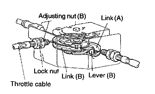 1. Adjust with the adjusting nut B so when the lever B hits the link A, the throttle cable play (inner cable play) reaches the standard value.