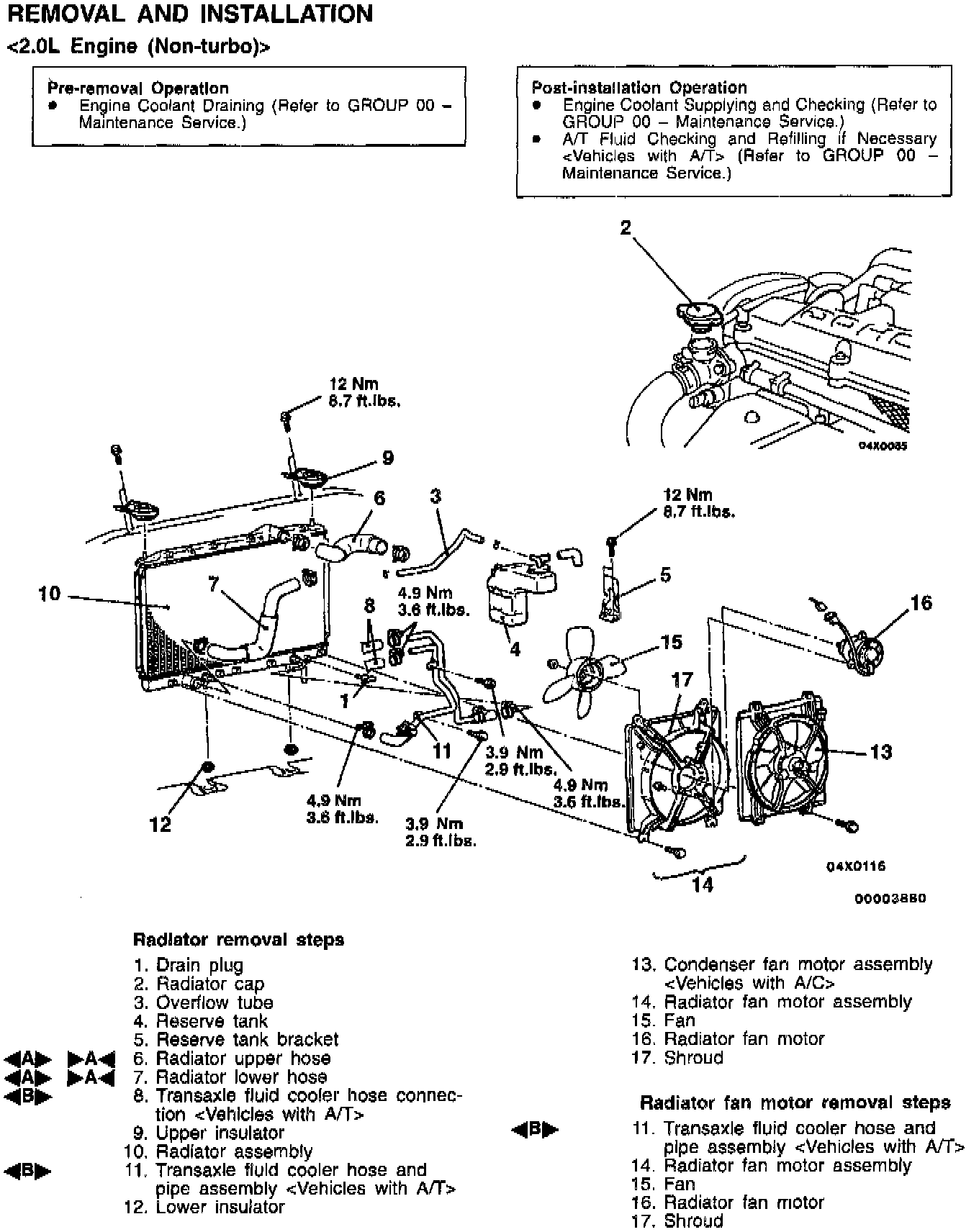 [B] Transaxle Fluid Cooler Hose/Transaxle Fluid Cooler Hose And Pipe Assembly Removal. After removing the hose from the radiator, plug the hose and the radiator nipple to prevent dust or foreign particles from getting in.