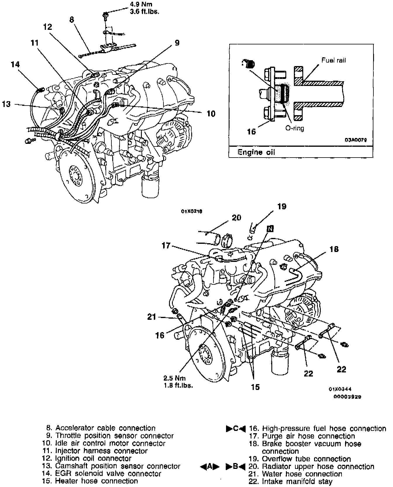 CAUTION: Do not let the engine oil get into the fuel rail.