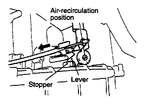 9. Set the inside/outside air changeover damper lever of the blower unit to air-recirculation position (with the inside outside air changeover damper lever touched to the stopper of the blower case) and install the cable to the lever pin.