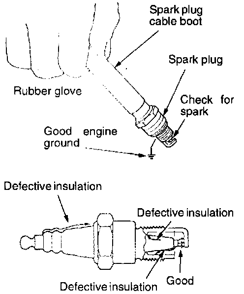 2. Ground the spark plug outer electrode (body), and crank the engine. Check for spark across the electrodes.