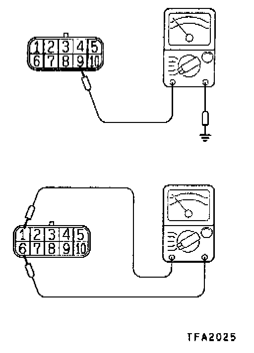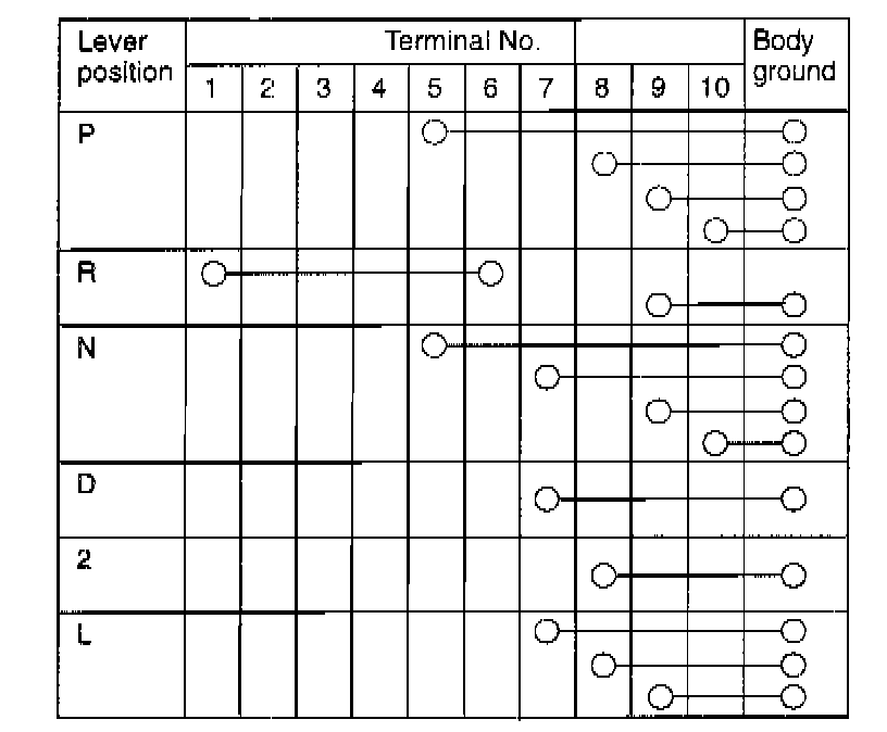 2. Check the continuity between sensor terminals and body ground (and terminals 1 - 6) while shifting the gearshift lever at each position. The continuity between sensor terminals and body ground (and terminals 1 - 6) should be as shown in the table.