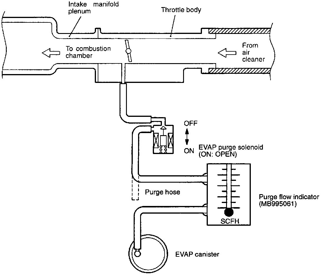 If the purge flow volume is less than the standard value, check the vacuum port and the vacuum hose for clogging. Also check the evaporative emission purge solenoid. If the purge flow volume is at the standard value, replace the EVAP canister.