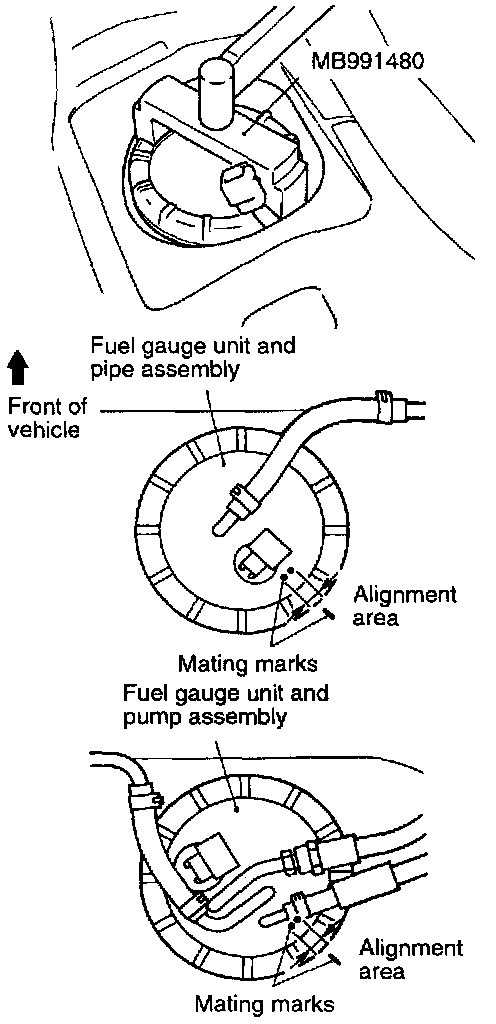 CAUTION: Make sure that the fuel gauge unit and pump assembly (or the fuel gauge unit and pipe assembly) does not turn together with the cap when tightening the cap. If the mating marks are not aligned, the position of the float will not be correct and the fuel gauge indicator light and the fuel level gauge will not operate properly.