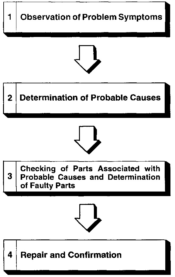 If an attempt is made to solve a problem without going through correct steps for troubleshooting, the problem symptoms could become more complicated, resulting in failure to determine the causes correctly and making incorrect repairs. The four steps below should be followed in troubleshooting.