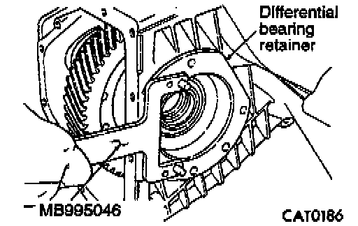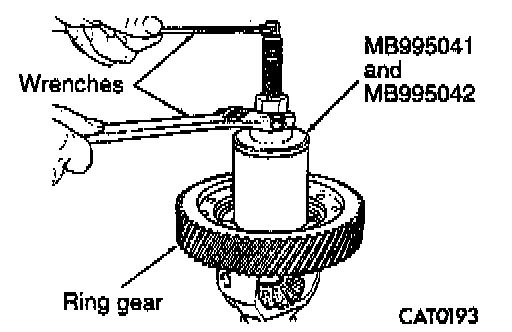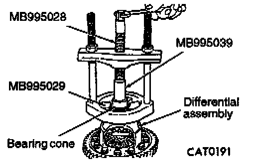 11. Remove differential bearing from ring gear side with Bearing and Gear remover MB995041 and MB995042.