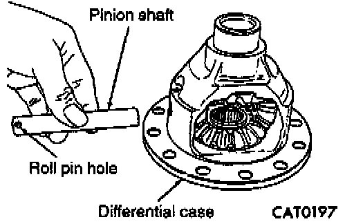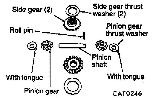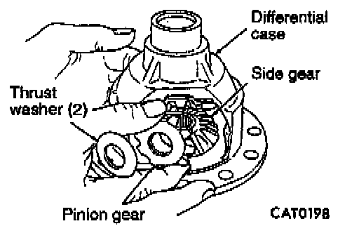 15. Remove pinion gears, side gears and tabbed thrust washers by rotating pinion gears to opening in differential case.