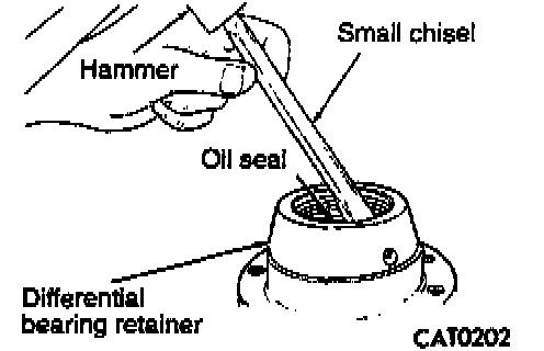 16. Remove oil seal from differential bearing retainer with a small chisel and hammer.