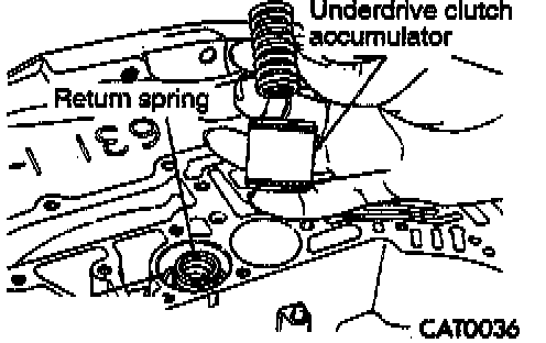 7. Remove underdrive clutch accumulator and overdrive clutch accumulator with return springs and seal rings.