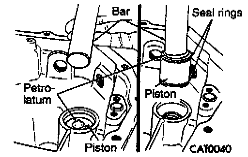 11. Put a dab of petrolatum on the top of low/reverse accumulator piston. Using a smooth-surface bar or equivalent, press the bar evenly against the petrolatum so it sticks to the piston. Pull out the piston.