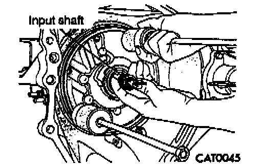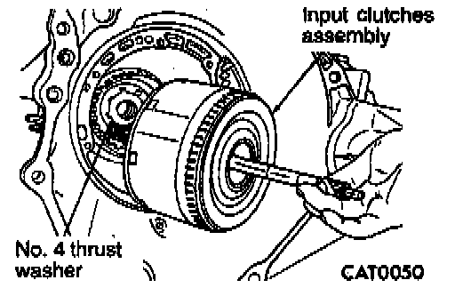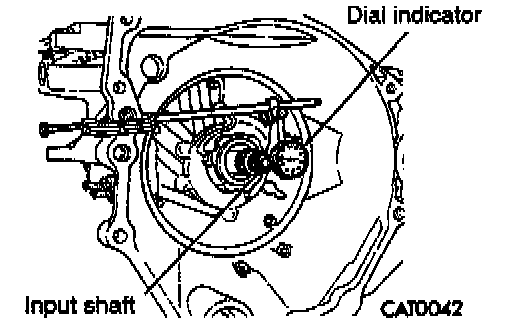 13. Measuring input shaft end play before disassembly will usually indicate when a No. 4 thrust plate change is required (except when major parts are replaced). The No. 4 thrust plate is located behind the overdrive clutch hub. Attach a dial indicator to transaxle bell-housing with its plunger seated against end of input shaft. Move input shaft in and out to obtain end play reading. End play specifications are 0.13 to 0.64 mm (0.005 to 0.025 inch). Record indicator reading for reference when reassembling the transaxle.