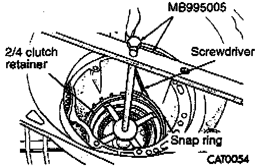 26. Install spring compressor M13995005. Using the special tool, compress the 2/4 clutch retainer just enough to remove the snap ring. Using a screwdriver, remove the 2/4 clutch retainer snap ring.