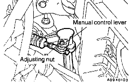 2. Loosen the adjusting nut, gently pull the transaxle control cable in the direction of the arrow and tighten the nut.