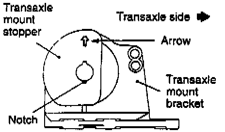 Align the notches on the stopper with the transaxle mount bracket with the arrow mark facing toward the shown direction. Then install the stopper.