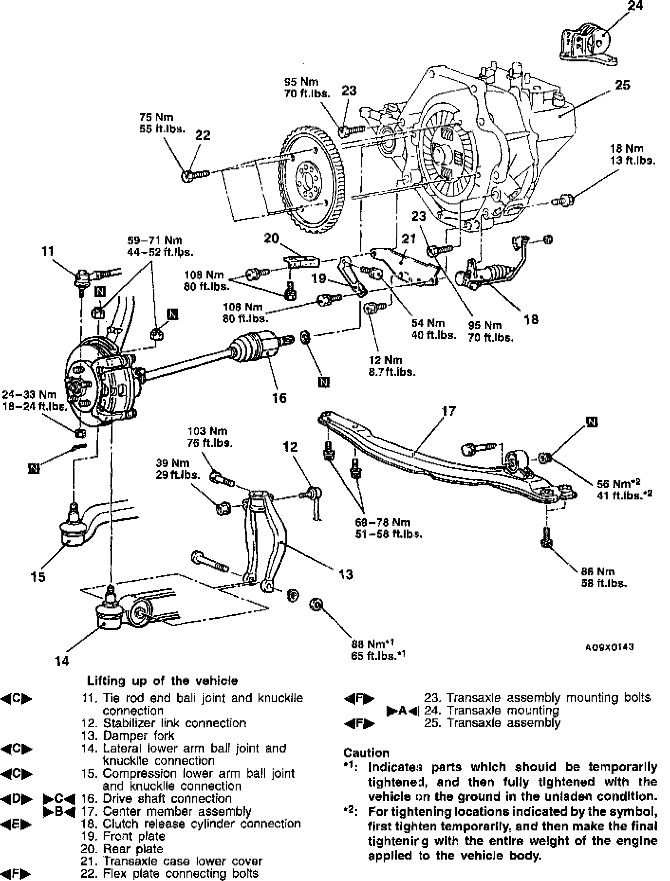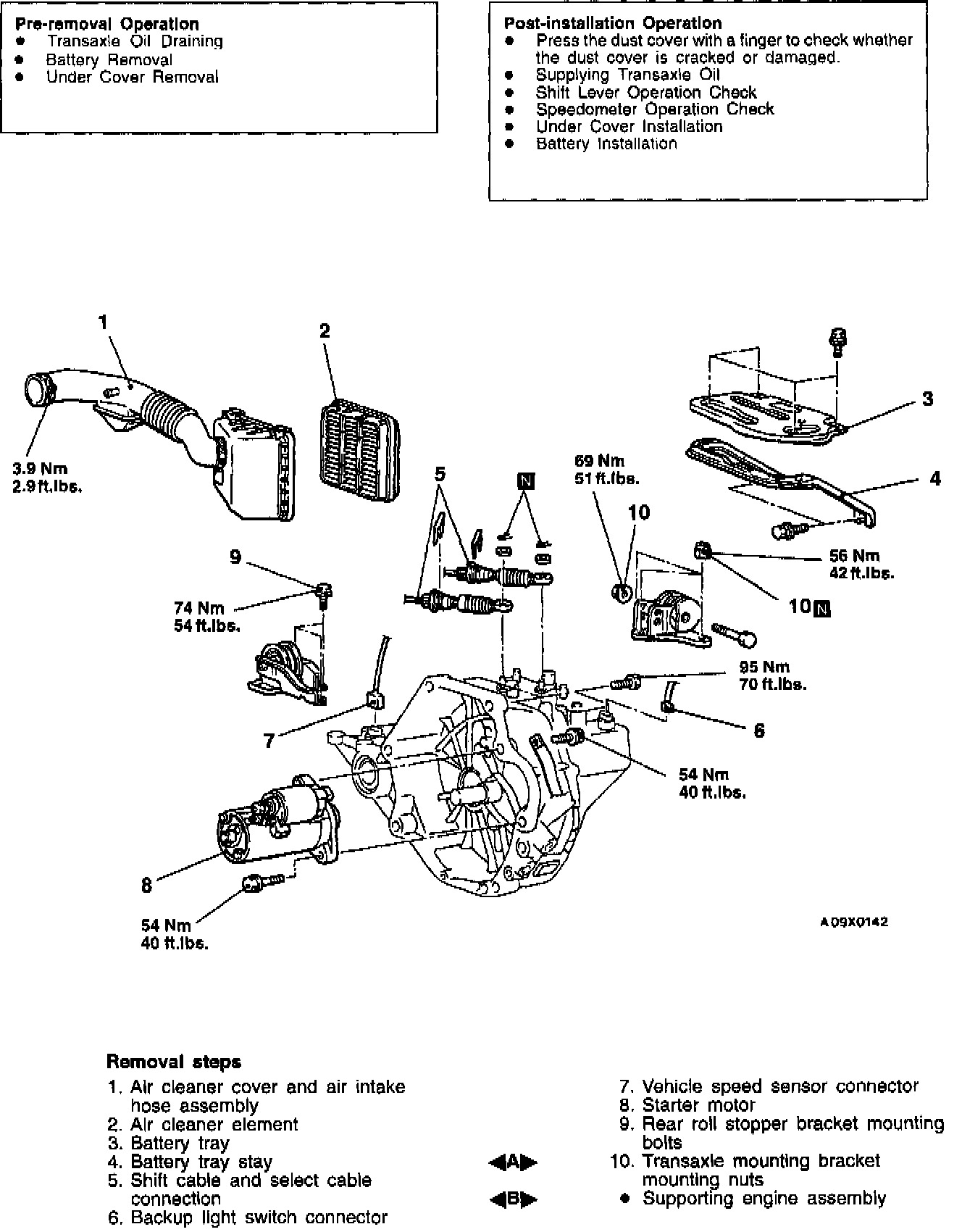 Jack up the transaxle assembly gently with a garage jack, and then remove the transaxle mounting bracket nuts.