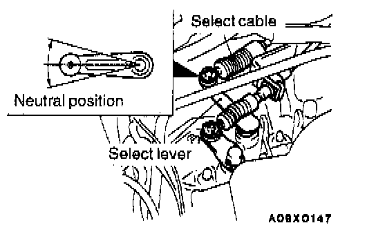 1. While leaving the shift lever inside the passenger compartment in the neutral position, install the select cable to the passenger compartment side of the shift lever.