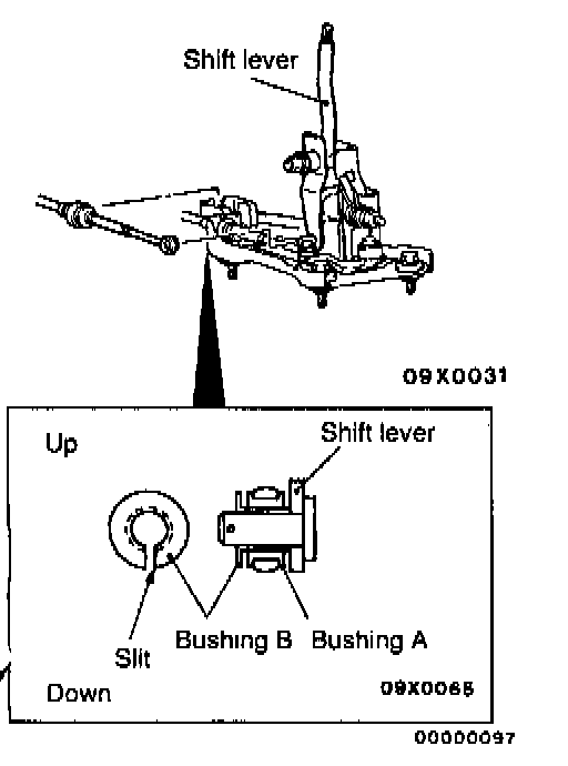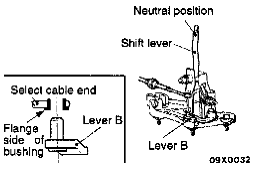 1. While leaving the shift lever inside the passenger compartment in the neutral position, install the shift cable to the passenger compartment side of the shift lever. Install so that the slit section of the bushing B is facing either up or down.