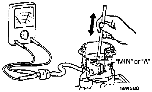 BRAKE FLUID LEVEL SENSOR CHECKThe brake fluid level sensor is in good condition if there is no continuity when the float surface is above "MIN" or "A" and if there is continuity when the float surface is below "MIN" or "A".